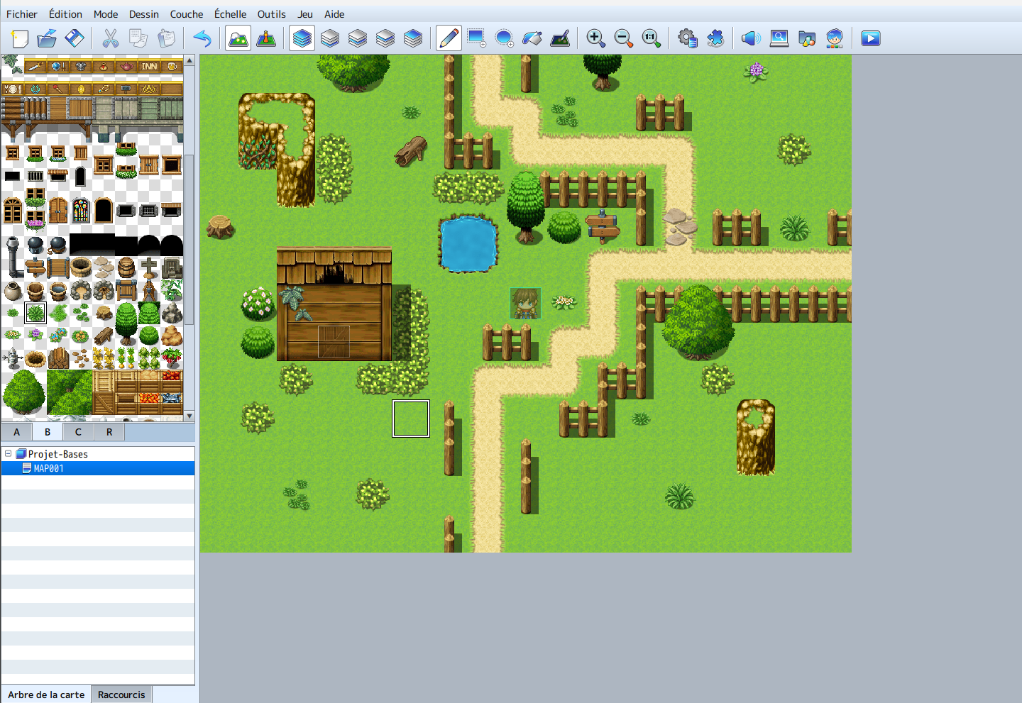 - Mapping : Consiste à « peindre » des cartes quadrillées qui seront ensuite utilisées comme carte du monde. La palette dans ce cas est appelée tileset (voir ci-dessous). ↩︎